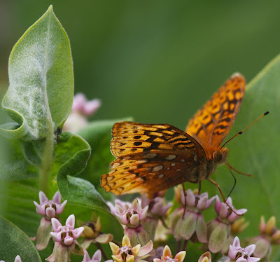 The Monarch and Fritillary butterflies were chasing each other away from the same patch of milkweed plants.